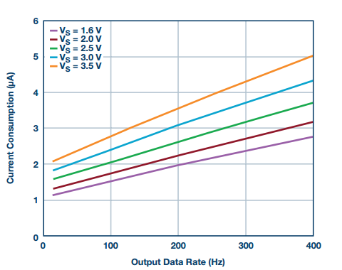 ADXL362和ADXL363不会通过欠采样混叠输入信号;它们采用全数据速率对传感器的整个带宽进行采样。功耗随采样速率动态变化,如图1所示。需要注意的是,这些器件可在功耗仅为3 μA的状态下,以最高400 Hz的速率进行采样。在可穿戴设备中,这些较高的数据速率可实现额外的功能,如单击/双击检测。采样速率可降至6 Hz,以便在被拾起时或者检测到运动时设备能启动,此时的平均功耗为270 nA。这也使ADXL362和ADXL363非常适合植入式应用,因为在这种应用中电池更换非常困难。