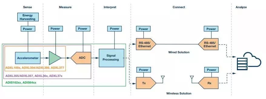 MEMS电容式加速度计在性能上已经取得巨大飞跃,因此,新的ADXL100x系列已经开始强力竞争并夺得以前由压电传感器主导的阵地。ADXL35x系列具有行业最佳的超低噪声性能,还能取代CBM应用中的传感器。新型CBM解决方案和模式已经开始与物联网架构相融合,形成更好的检测、连接及存储与分析系统。ADI公司的最新加速度计将为边缘节点带来更加智能的监控,帮助工厂管理方实现完全集成的振动监控和分析系统。