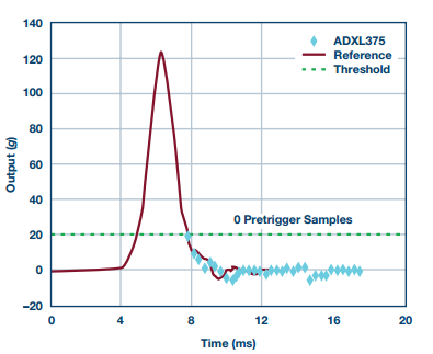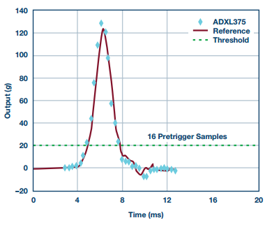在把加速数据存储在FIFO中并检查是否存在活动事件时,所有这些加速度计都能使整个系统处于关断状态。发生冲击事件时,事件发生前收集的数据被冻结在FIFO中。如果没有FIFO,如果要在事件发生之前捕捉样本,就要求处理器连续采样并处理加速信号,结果会大幅缩短电池寿命。ADXL362和ADXL363 FIFO可以存储超过13秒的数据,因而能清楚展示活动触发之前发生的事件。不使用功率占空比,而是在所有数据速率下均采用全带宽架构,由此防止输入信号混叠,从而维持超低功耗。