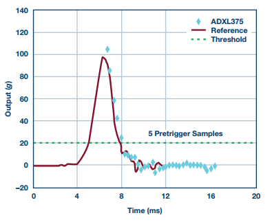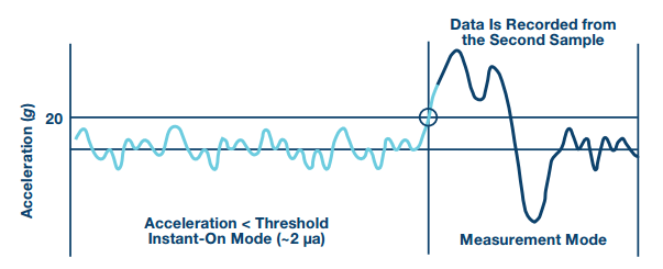 借助即时导通冲击检测特性,用户可以对ADXL372进行配置,使其能在超低功耗模式下捕获高于特定阈值的冲击事件。如图8所示,在发生冲击事件之后,加速度计会进入全测量模式,以便准确地捕获冲击特性。