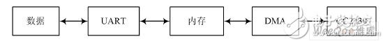 在发送数据时, 数据通过串口USART 进入CC2430 的DATA 内存区。为了提高传输速度, 使用DMA 传输方式将内存区中的数据送达射频模块的TXFIFO 中, 数据进入射频模块后, 经过一系列的硬件处理, 最后通过天线发射无线信号。接收数据是发送数据的逆过程。射频模块从天线接收到无线信号, 通过一系列的硬件处理, 将信号转换为数据, 存放在RXFIFO中, 再通过DMA 方式送入DATA 内存区中, 最后通过USART 串口将接收到的数据送出。数据在无线模块的传输路径如图2 所示。