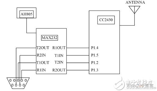 电路系统主要由电源、复位电路、串口连接电路和无线收发电路组成。可实现串口数据的无线收发, 即发送数据时, 计算机通过MAX485 将RS 485 的标准电平转换为T TL 电平, 再通过CC2430 无线发送。接收数据则是CC2430 先接收到数据信号, 然后经MAX 485将TT L 电平转换为RS 485 的标准电平, 再通过RS2485 向上位机输入数据。由于CC2430 具有低功耗的特性, 因此选用2 节干电池为模块供电。另外, 还选用了AH805 升压稳压器, 可将3 V 电压升高至5 V, 故电源部分可提供3 V 或5 V 2 种电压。其中, 3 V 电压为CC2430 供电; 5 V 电压为MAX485 和复位电路供电。若将系统用于PC 机间的通信时, 可以通过引入RS 2322485 转换器来实现RS 232 标准电平到RS 485标准电平的转换, 以兼容PC 机RS 232 串口。