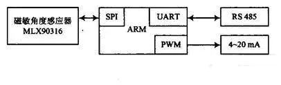 数据处理单元由磁敏角度感应器、微处理器单元、通信接口以及输出模块,具体的功能框如图所示。