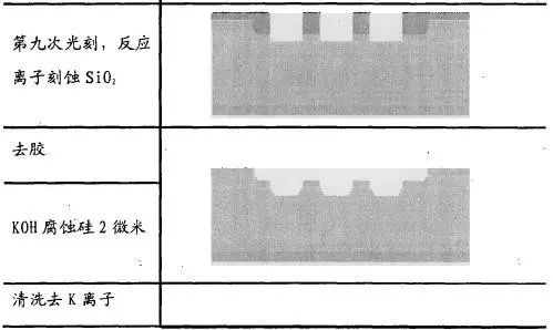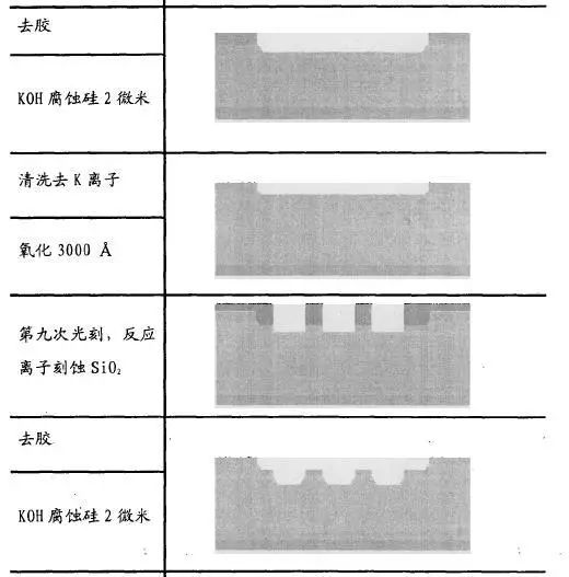 为加工出图示的加速度传感器,主要采用下列加工手段来实现。采用注入、推进、氧化的创新工艺来制作压敏电阻;采用KHO各向异性深腐蚀来形成质量块;并使用AES来释放梁和质量块;最后利用键合工艺来得到所需的“三明治”结构。