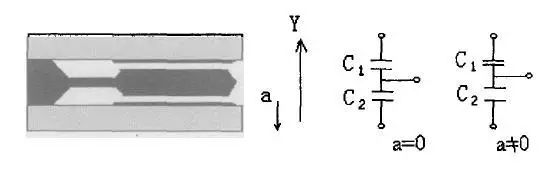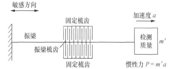一根琴弦绷紧程度不同时弹奏出的声音频率也不同,谐振式加速度计的原理与此相同。振梁一端固定,另一端链接一质量块,当振梁轴线方向有加速度时梁会受到轴线方向的力,梁中张力变化,其固有频率也相应发生变化。若对梁施加一确定的激振,检测其响应就可测出其固有频率,进而测出加速度。激振的施加和响应的检测通常都是通过梳齿机构实现的。