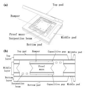 当前大多数的电容式加速度传感器都是由三部分硅晶体圆片构成的,中层是由双层的SOI硅片制成的活动电容极板。如图所示, 中间的活动电容极板是由八个弯曲弹性连接梁所支撑,夹在上下层两块固定的电容极板之间。提高精度很重要的一项措施就是采用差动测量方式,极大地提高了信噪比。因此,电容式MEMS加速度传感器几乎全部采用差动结构。