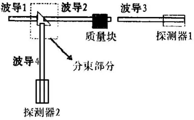 光波导加速度计的原理如下图所示:光源从波导1进入,经过分束部分后分成两部分分别通入波导4和波导2,进入波导4的一束直接被探测器2探测,而进入波导2的一束会经过一段微小的间隙后进入波导3,最终被探测器1探测到。有加速度时,质量块会使得波导2弯曲,进而导至其与波导3的正对面积减小,使探测器1探测到的光减弱。通过比较两个探测器检测到的信号即可求得加速度。