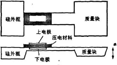 压电式加速度计利用了压电效应,或者更确切地说,是利用了正压电效应,即某些电介质在沿一定方向上受到外力的作用而变形时其内部产生极化现象,同时在它的两个相对表面上出现正负相反的电荷。通过测量压电材料两级的电势差即可求得其形变压电原理在宏观尺度的加速度计中应用颇为广泛,这类加速度计的构造多为基座和质量块之间夹一压阻材料(如下图)。