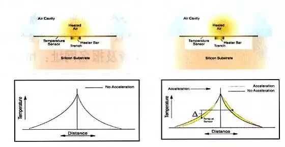 一个被放置在芯片中央的热源在一个空腔中产生一个悬浮的热气团,同时由铝和多晶硅组成的热电偶组被等距离对称地放置在热源的四个方向。在未受到加速度或水平放置时,温度的下降陡度是以热源为中心完全对称的。此时所有四个热电偶组因感应温度而产生的电压是相同的(见下图)。由于自由对流热场的传递性,任何方向的加速度都会扰乱热场的轮廓,从而导致其不对称。此时四个热电偶组的输出电压会出现差异,而热电偶组输出电压的差异是直接与所感应的加速度成比例的。在加速度传感器内部有两条完全相同的加速度信号传输路径:一条是用于测量X轴上所感应的加速度,另一条则用于测量Y轴上所感应的加速度。