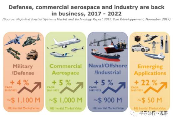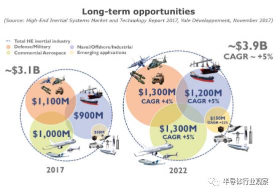 根据统计机构Yole最新公布的数据显示2017年高端惯性系统市场已经超过30亿美元,国防占据36%市场份额,商用航空航天占据33%市场份额,海事/航海/工业占据剩余的31%市场份额。展望未来五年,高端惯性系统市场的复合年增长率(CAGR)为5%。