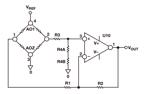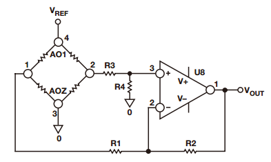 图1为采用一个典型的由单放大器构建的差动放大器,该放大器与一个传感器桥路相连。