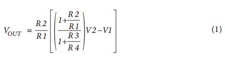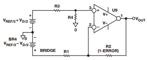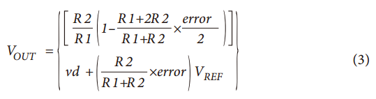 电阻R2的公差引起的误差为R2 (1 – error)。通过叠加原理,同时使R1 = R3,R2 = R4,在计算并进行排列之后,输出电压(VOUT)为: