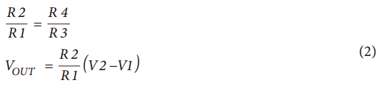 输出等于两个输入之差乘以增益系数,该系数可设定为1.当电阻比匹配良好时,等式2成立。假定完美匹配电阻值 分别为:R2 = R4 = 10 kΩ,R1 = R3 = 1 kΩ,V1 = 2.5 V, V2 = 2.6 V,则有VOUT= 1 V.