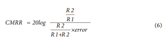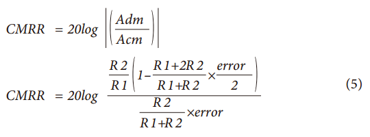 从等式4可见,当电阻值不存在误差(即error = 0)时,则 Acm = 0,放大器仅对差分电压作出响应,则为: