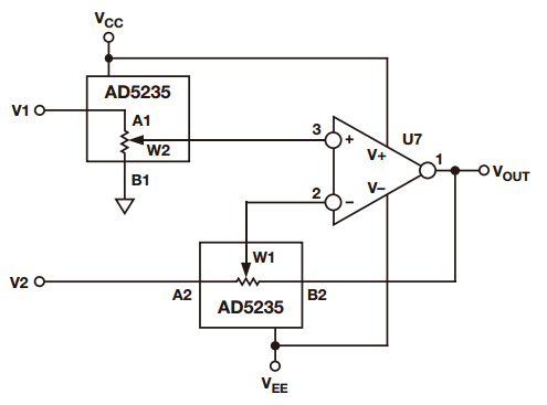 ➤ d.作为对精度要求不高的电路的替代途径,可使用数字电位计,如图7所示。AD5235(一种非易失性存储器、双路 1024 位数字电位计)配合AD8628构成一种差动放大器,其增益为15(G = 15)。