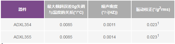 通常,数据手册上不会显示可重复性和对振动校正误差(VRE)的抑制能力,因为这些参数可能暴露产品性能较低。例如,ADXL345是一款针对消费类应用的通用加速度计,VRE不是设计人员的重要关注参数。然而,在惯性导航等高要求应用、倾斜应用或振动频繁的特定环境中,对VRE的抑制能力可能是设计人员的重点关注对象,因此ADXL354/ADXL355和ADXL356/ADXL357数据手册会 给出此类参数。