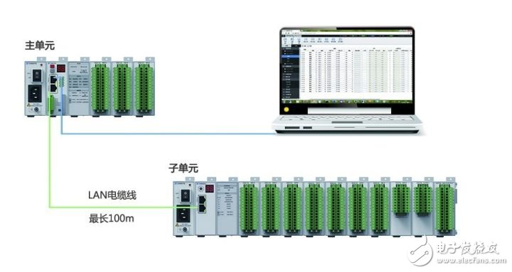 在测量场所比较分散时,可采用多台级联,测量现场与数据记录仪可分开安装,将子单元安装在测量现场,主单元用来监视数据。