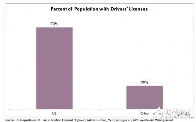 中国拥有汽车驾照的人口仅20%(来源:seekingalpha.com)这是由几个因素促成的。在中国,由于车子的价格较平均收入更高,因而拥有较美国与欧洲更大量的非驾驶(non-driving)人口。这加速市场对于替代交通运输工具的需求。