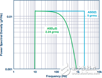 利用公式通过线性加速度参数乘以ASDF (f)曲线幅值2.24grms,可估算产生的噪声电平为0.02°/s (rms)。此噪声电平比通过公式5到的0.045°/s (rms)低55%,利用公式的方法未采用频谱项评估此噪声源。这种改善是采用频谱项定义振动曲线以获取值的一个示例。