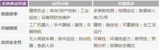 工业系统智能检测的推动因素工业机械和流程最具价值的进步集中在有形的系统级优势上,而这通常会带来设计和实现方面的挑战,这些挑战又会发展成新的问题解决方案和业务模式。这种系统级推动因素可以归纳为三项追求,即对资源效率、关键精度和更高安全性的追求。瞄准这些横跨多个行业的改进的应用,包括跨越空中/地面/海上、室内/室外、短期/长期和人/机等,但无论如何,它们都依赖于共同的属性;即精度、可靠性、安全性和智能处理与分析,如表1所示。