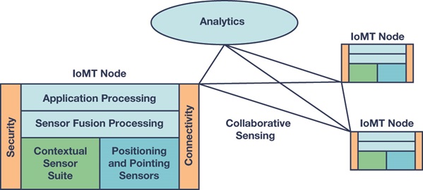 运动物联网节点输出的有效性和价值最为依赖的是核心传感器的质量以及它们高保真地捕捉应用情境的能力。因此,融合处理是传感器校正/增强的必然选择,也是理想捕捉传感器间状态动态的必备条件(例如,在任意给定时间点,哪个传感器最可靠)。应用级的处理以分层方式融入解决方案之中,并根据环境特点进行优化,包括适当的边界条件。虽然这种方式是自动的,但在有些情况下,这些节点会协同工作,比如在地面或空中成群的无人驾驶交通工具中。在这些情况下会部署安全链路,强调可靠传输和受保护的特有身份信息,如图2所示。