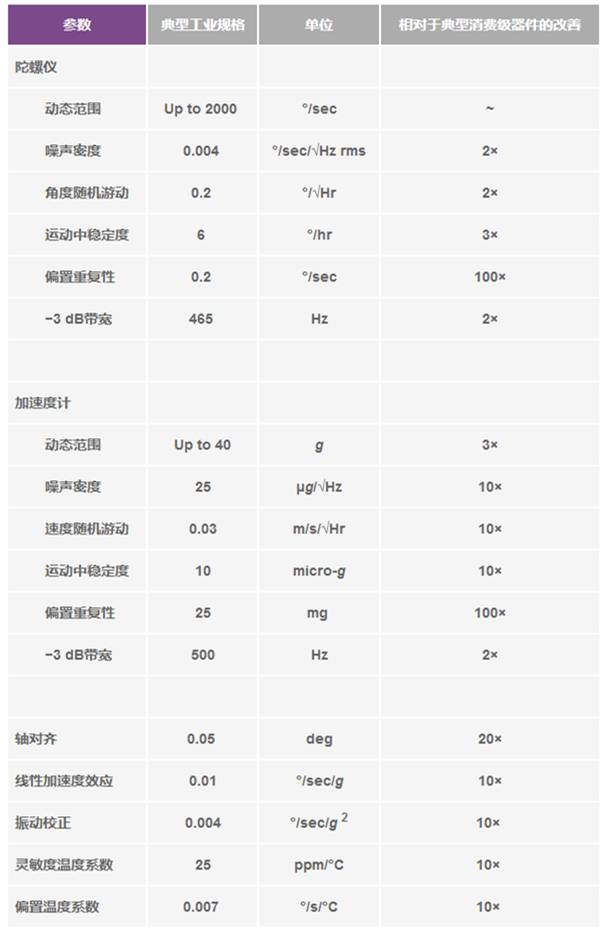 表6.工业MEMS器件对所有已知潜在误差源进行全面测定,通常能实现消费类器件高出一个数量级或更高的精度水平