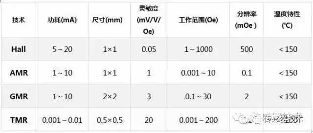 霍尔元件、AMR元件、GMR元件以及TMR元件的技术参数对比