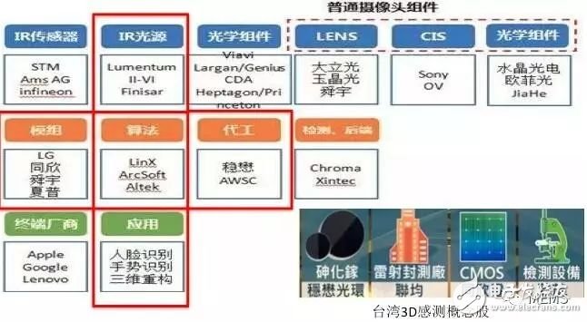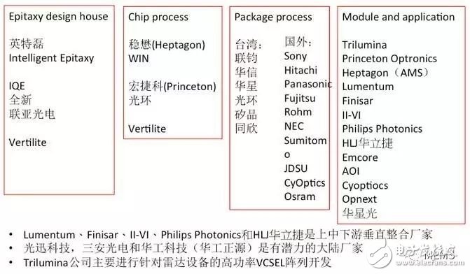 图9 VCSEL的应用与未来市场趋势***与大陆VCSEL的发展现状如图10所示,大陆与***VCSEL的产业链现状很像十年前的LED,目前内地跟VCSEL有相关的公司可谓凤毛麟角,除了国内光通讯器件厂商光迅科技已有VCSEL商业化产品推出,在消费电子领域,内地尚无一家拥有VCSEL芯片量产能力的企业,当然有潜力的公司也不是没有,大家熟悉的三安光电和华工科技(华工正源)是有潜力的大陆厂家,而拥有四元红黄MOCVD设备的公司例如乾照与华灿也有机会可以跨入这个领域,当然技术是关键,在美国硅谷,有一批华人专注于这个领域,例如Intelligent与Vertilite都是华人核心团队组成的公司,如果可以吸引他们回来,这个行业在内地可能可以发展的比较快。当然***在这方面的发展已经非常成熟,也得到国际大厂的认可,上游方面,全新、联亚与光环科技都积淀了十五年的外延与芯片技术,LED大厂晶电也早做了布局,专注芯片制造的稳懋更是砷化镓芯片最专业的代工厂,VCSEL工艺对稳懋来说也非难事,除了拿到苹果3D摄像头供应链Lumentum的代工订单,近期也得到3D传感模组大厂Heptagon(AMS)的VCSEL芯片代工订单,另外一家砷化镓六寸晶圆厂宏捷科也是Princeton Optronics的代工厂家。中游的封装方面,***累积了长久的精密封装实力,目前联钧、华信、华星、光环、矽品与同欣都是有实力可以达到世界大厂要求的封装技术,最后介绍一家坚持15年的专注VCSEL技术与产品的公司华立捷,这家公司具有上中下游垂直整合的实力,也是目前在VCSEL模组可以跟国际大厂竞争的公司。所以整体来看,***的VCSEL显现出一定的实力,现在因为苹果新机也得到丰硕的果实,大陆这方面就几乎空白了,大陆有机会翻转吗?