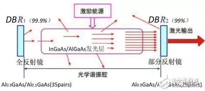 图2 分布布拉格反射镜DRR原理示意图激光的谐振效应(Resonance):激光的发光区就是它的「谐振腔(Cavity)」,谐振腔其实可以使用一对镜子组成,如图3所示,使光束在左右两片镜子之间来回反射,不停地通过发光区吸收光能,最后产生谐振效应,使光的能量放大,一般激光二极管的两片镜子就是用DBR镀膜来控制谐振腔的谐振效应。激光二极管的电激发光(EL:Electroluminescence):我们以「砷化镓激光二极管(GaAs laser diode)」为例,先在砷化镓激光二极管芯片(大约只有一粒砂子的大小)上下各蒸镀一层金属电极,对着芯片施加电压,当芯片吸收电能产生「能量激发(Pumping)」,则会发出某一种波长(颜色)的光。发射出来的光经由左右两个反射镜来回反射产生「谐振放大(Resonance)」,由于右方的反射镜设计可以穿透一部分的光,所以高能量的激光光束就会由右方穿透射出,如图3所示。