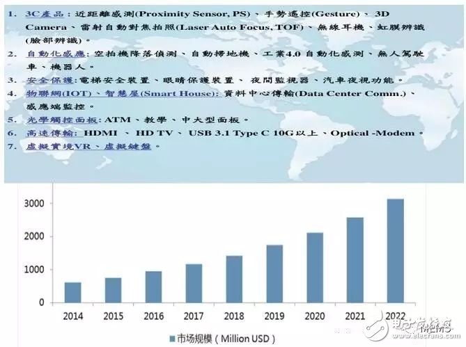 图8 芬兰Picosun派克森公司推出的ALD原子层沉积技术的设备,可以让VCSEL的器件更稳定从光通信到消费电子,VCSEL激光器迎来爆发VCSEL曾在光通信应用市场里“发光发热”,被广泛关注,现在又增加了3D传感的应用,以市场来说,如果以华为、OPPO、VIVO、三星等为首的高端机型第二梯队快速响应与普及,每年全世界消费10多亿部智能手机,如果每部手机嵌入2-3颗VCSEL激光器件,就是二三十亿颗的市场规模。如今,全球VCSEL的总收入已接近8亿美元,预计到2020年该值会增长到21亿美元。未来,除了光通信与3D传感,当VCSEL激光器量产供应链形成之后将带动产品价格的全面平民化,包含AR智能眼镜、智能驾驶的激光雷达等一系列颠覆式应用将彻底从概念化小众市场得到快速普及,如图9所示,VCSEL市场将会进一步爆发。