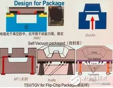 MEMS芯片设计都需要考虑封装,甚至针对封装进行特殊优化。图3给出了几个较好的针对封装进行特殊优化设计的MEMS芯片方案。其中,上面采用了玻璃仓加硅模的方案,特点是电阻处于真空中,抗环境干扰能力强,稳定性好;下面是三家主流厂商TSV和TGV倒装焊结构,其特点是没有Wire bond、抗振动冲击,同时,有些技术方案中应用了SiO2介质隔离,从而能够适应高温环境。另外,据盾安传感科技公司技术总监段飞表示,盾安传感科技自主研发设计的一款MEMS芯片中也针对封装进行了特殊优化。