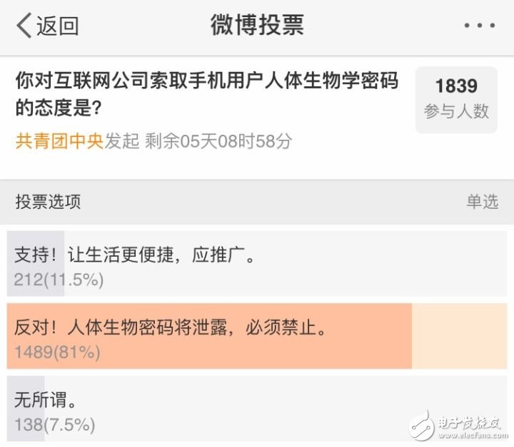 针对互联网公司通过指纹扫描、面部识别、语音识别等方式索取手机用户人体生物密码的安全性,团团也在微博中发起了投票: