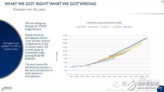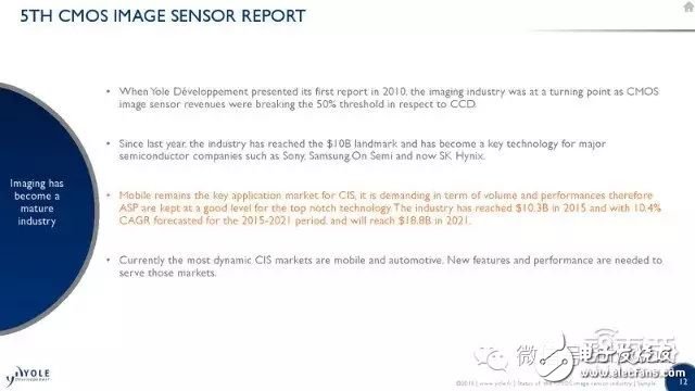 2010年Yole发布这一系列报告的第一篇时,整个成像行业还处在一个转折点,那时CMOS(互补型金属氧化物半导体感光元件)的市场收益才刚刚达到当年主流CCD(电荷耦合器件摄像机)的一半。