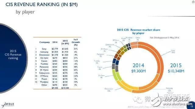 表现最抢眼的是索尼,其依靠在数字成像和移动端应用领域的技术优势,同时受益于智能手机双摄像头对图像分辨率的需求,索尼在2015年赢得了这个市场下出货量和营收的双料冠军。