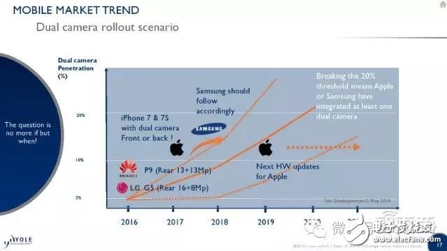 但是本文机构从全球视角来看,还是认为2016是双摄爆发的元年,这一阶段的代表机型包括LG G5、华为 P9以及iPhone 7 Plus。随着三星加入双摄趋势,预计在2020年前后,双摄智能手机的渗透率将超过20%。