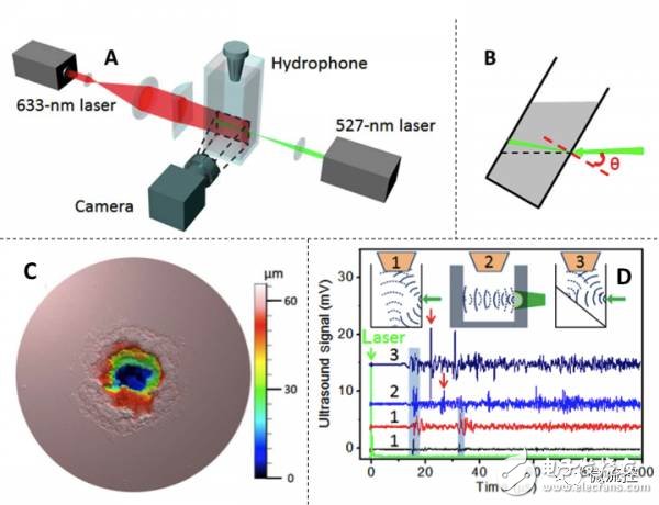 在实验中,研究团队首先利用纳秒激光照射装有金纳米颗粒分散液的玻璃比色皿。经一段时间照射,激光在比色皿内壁的聚焦处会产生形如火山口并附着有金纳米颗粒的微腔。金纳米颗粒在脉冲激光的照射下会经历快速的、周期性的体积膨胀和收缩,从而产生超声波(光声效应)。而在金纳米颗粒和腔体的共同作用下,定向的高频超声波通过声波驱动效应,驱动分散液产生高速流动。这里,金纳米颗粒附着的微腔是连接光声效应和声波驱动效应的关键。一旦微腔形成,将分散液替换为纯水或其他溶液,激光亦可驱动其他液体流动。这一有趣的实验发现有机地结合了纳米光子学、声学、微流体学和材料科学,在光学调控或触发的微结构器件系统中有极为广泛的应用前景。