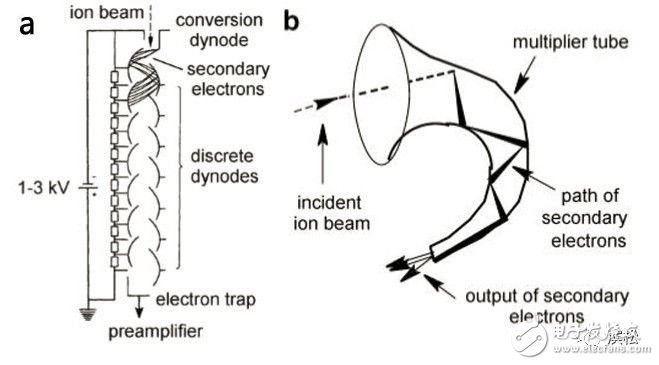 而电子倍增器(electron multiplier, EM)也是目前使用较多的质谱探测器,其形式多样,基本原理是对带电粒子产生的次级电子进行放大。