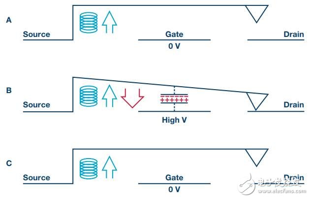 该过程如图2中的情况B所示。因此,源极和漏极之间的电路闭合,开关现已接通。拉下开关梁所需的实际力大小与悬臂梁的弹簧常数及其对运动的阻力有关。注意:即使在接通位置,开关梁仍有上拉开关的弹簧力(蓝色箭头),但只要下拉静电力(红色箭头)更大,开关就会保持接通状态。最后,当移除栅极电压时(图2中的情况C),即栅极电极上为0 V时,静电吸引力消失,开关梁作为弹簧具有足够大的恢复力(蓝色箭头)来断开源极和漏极之间的连接,然后回到原始关断位置。