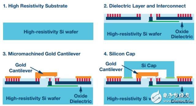 图3显示了利用MEMS技术制造开关的四个主要步骤。开关建构在一个高电阻率硅晶圆(1)上,晶圆上面沉积一层很厚的电介质,以便提供与下方衬底的优良电气隔离。利用标准后端CMOS互连工艺实现到MEMS开关的互连。低电阻率金属和多晶硅用于形成到MEMS开关的电气连接,并且嵌入到电介质层(2)中。标示为红色的金属过孔(2)用于提供到开关输入、输出和栅极电极的连接,以及焊芯片上其他位置的引线焊盘的连接。悬臂式MEMS开关本身利用牺牲层进行表面微加工,在悬臂梁下方产生气隙。悬臂式开关梁结构和焊盘(3)利用金形成。开关触点和栅极电极由低电阻率金属薄膜沉积在电介质表面而形成。
