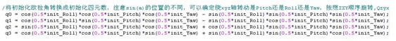 第二步是初始化四元数,常见的轴向定义是绕x轴旋转是Roll,绕y轴旋转是Pitch,绕z轴旋转是Yaw,我的程序中也有这样的定义,不过被我注释掉了,这里举个另外一种轴向定义来对初始化四元数进行说明,方便比较,也是我目前正在用的轴定义。