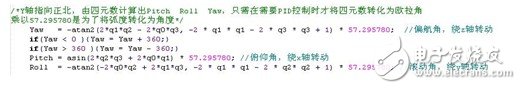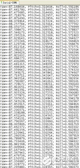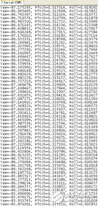 图2:由四元数求出的最终姿态角,其中Yaw为航向角,表示机头偏离正北方多少度,范