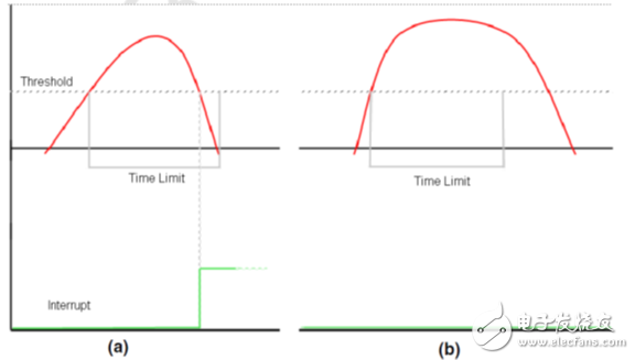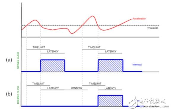 如下图,sensor通过检查加速度的变化是否有超出预先定义的阈值,然后在规定的时间内(time limit)又是否小于此阈值来判断一个single click 的动作,阈值和时间(time limit)就定义了加速的的变化波形。下图中,a 同时满足了阈值和时间限制的条件,是一次成功的动作的识别,然后产生了中断。b只满足了大于阈值的条件,但在规定时间限制内没有降到阈值下,所以不满足识别的条件。
