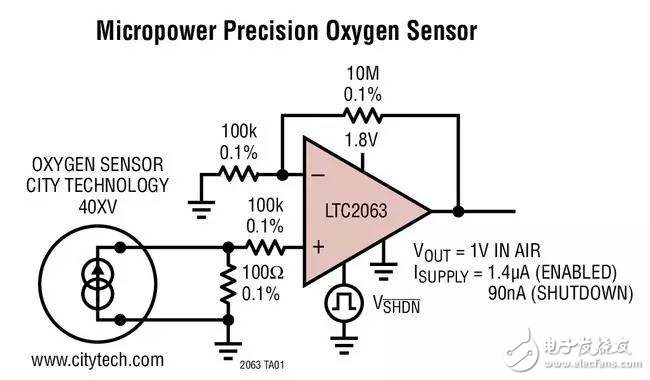 由于该气体传感器在正常氧气环境中产生 100μA 并需要一个 100Ω 负载电阻器,因此最终生成的输入信号通常约为 10mV。LTC2063 的轨至轨输入意味着一直到非常低的氧气浓度都不必进行额外的 DC 电平移位。